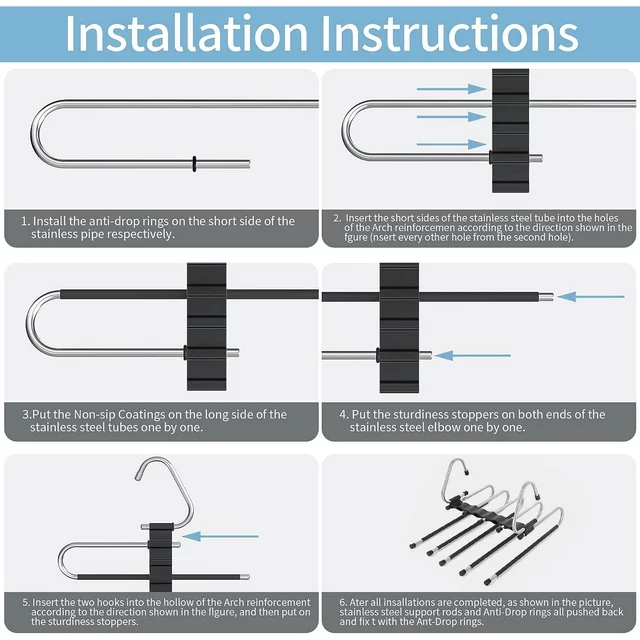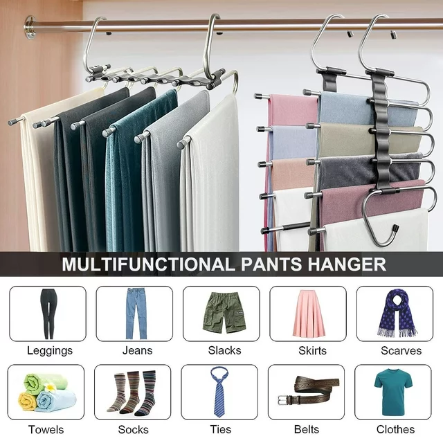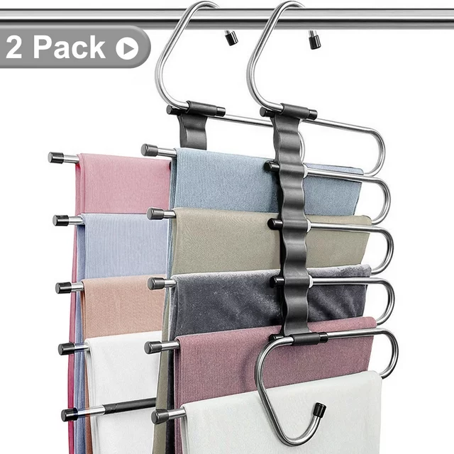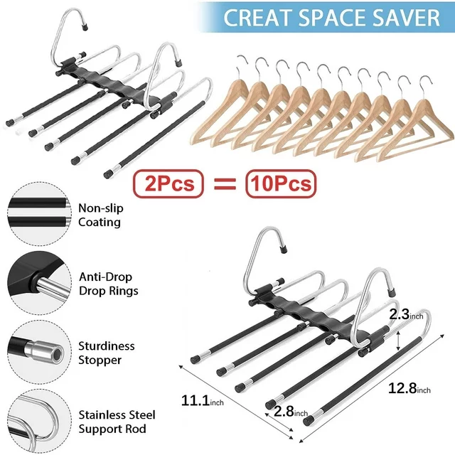 Specifications: Color:Black Material:Stainless Steel Number of Pieces:2 Product Dimensions 12.8"L x 11.1"W x 2.3"H 【Pants Hangers Space Saving】Those space saving pants hangers are made of high grade anti-rust stainless steel & high quality ABS plastic.As its premium quality, it will always durable and can keep a good shape. Don’t worry about the distortion of this 5 tier pants hangers.80% Space can be saved for your closet! 【Extra Unique Holes Design】Enjoy more closet space saving for with 5 clothes can be hang in each pants organizer! Clean up your closet space and a great space saving wardrobe organizer.Provides a complete multifunctional pants racks and clothes organizer. 【Two Uses Hangers】Pants racks for hanging pants organizer can keep your clothing on horizontal or vertical.Maximize to save the space of your closet for slack hangers, jeans organizer for closets, skirt organizer hangers, trouser hangers, or scarf organizer ,Tank top hangers, Bra hangers while keep it neat and well organized.With instructions in it the pants rack is very easy to assemble. 【Anti-Slip Design】The multifunctional pants rack is equipped with anti-slip coating in each rod and will keep your pants remain on the hanger.Easy to pull the pant a little farther out from the rest before removing it from the hanger.With Anti-slip rubber ring on each rod to prevent your pants off when pull out.Each rod has an anti-stopper at the end.