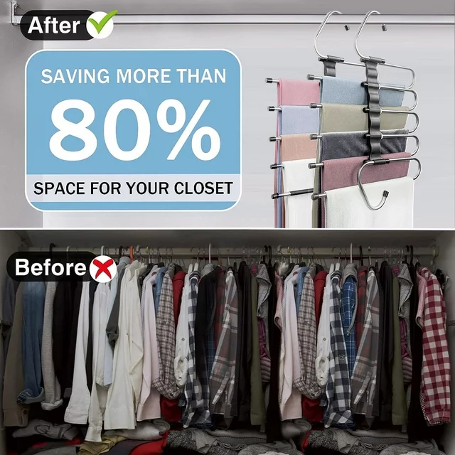 【80% Space Saving】-This is a unique vertical/horizontal two use multifunctional pants rack hanger.Each one can holds up at least 5 pants or jeans.Maximum saving space,and keeping your closet neat and tidy.