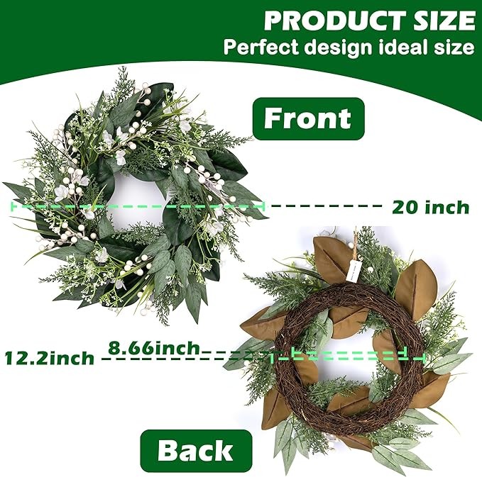 20 inch Spring Wreaths for Front Door with White Berries, Green Wreath with White Flower for Window Wedding Decor Home Porch Farmhouse Patio Garden Decor All Seasons