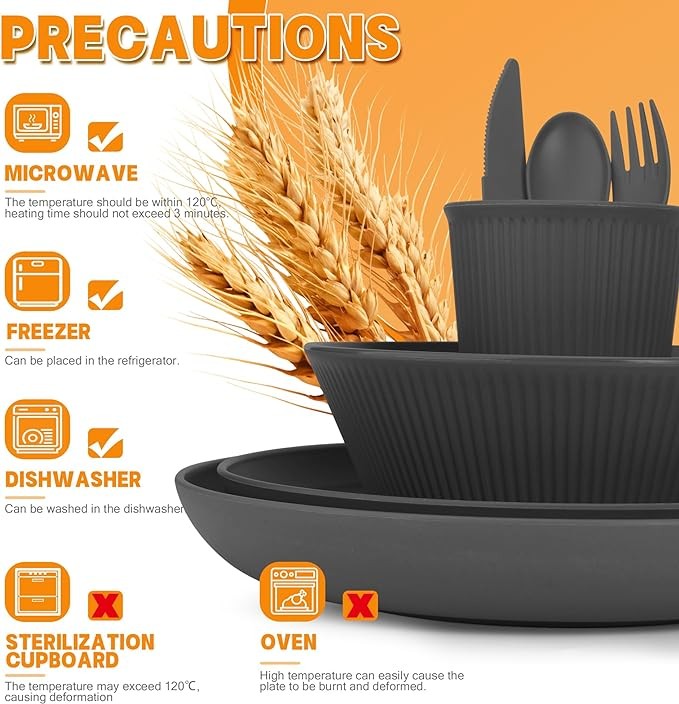 ? DISHWASHER & MICROWAVE SAFE: Our premium quality wheat straw dinnerware sets are safe for use in the microwave and dishwasher. They are easy to use, clean and store. Note: The temperature resistance reaches up to 248 degrees Fahrenheit (120℃).