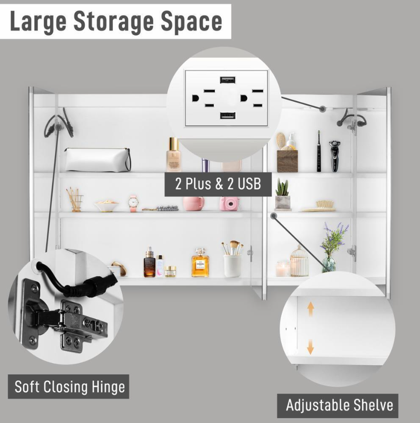 Adjustable Shelves, With Mirror, With Dimmable LED, with Charging Station