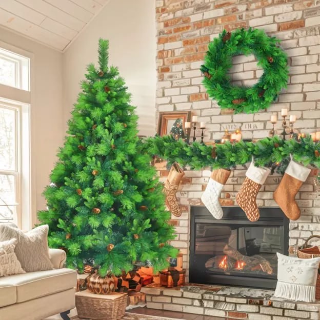 Stunning Appearance: Create the ultimate holiday scene with Artificial Christmas Tree Set. The set includes a tree with 844 branch tips and 50 pine cones, a garland with 220 branch tips and 9 pine cones, and a wreath with 90 branch tips and 5 pine cones. Let this collection transform your space into a winter wonderland.