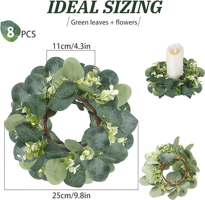 Enough Quantity: there are 8 pieces of eucalyptus leaves candle rings wreaths in each package, and the abundant amount allows you to choose any one of them to decorate your home without having to worry about substitution