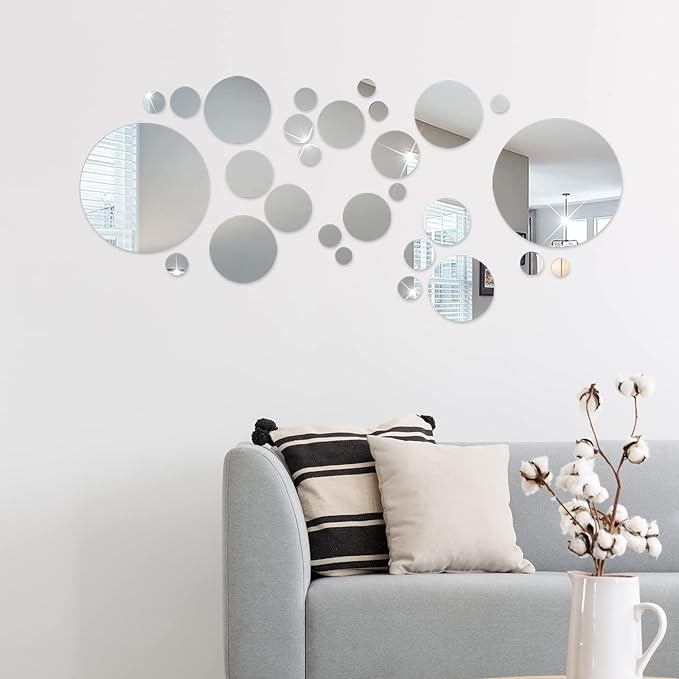 ?【Package Include】You will get 32 pieces decorative mirror wall stickers in round shape. The acrylic wall stickers have 4 different sizes: 15cm/5.9 inch (2 pieces), 8cm/3.1 inch (4 pieces), 6cm/2.4 inch (6 pieces), 3cm/1.2 inch (14 pieces).