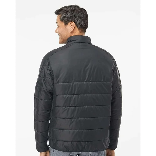 2 oz./yd² (US), 3.3 oz/L yd (CA), 100% recycled polyester. Contrast adidas logo on right collar. Baffle construction. 3-stripe logo on sides. 3.4 oz /yd², 100% recycled polyester synthetic fill.