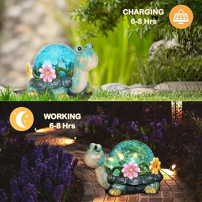 This adorable turtle garden statue is a wonderful addition to the beauty of any backyard or garden. Plant this solar garden statue to garden, trees, flowers, flowerbed, fence, walkway or anywhere you want.