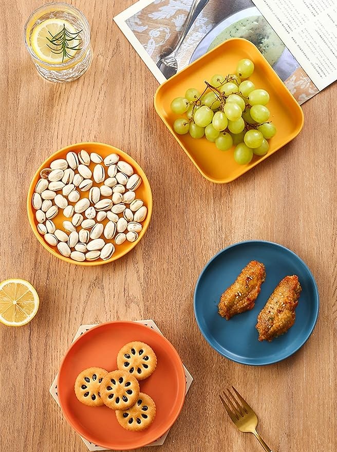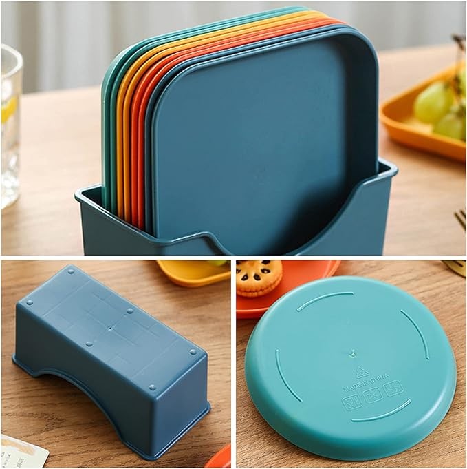 FUNCTIONAL DESIGN:8 pcs plates can be placed in one base,This fruit plate is lightweight and easy to store. Rounded corners, one-piece molding, no burrs, no hand injury.Heighten the bottom of the plate, reduce wear and tear, and place it firmly.Can be stacked at will, convenient for storage and saving space.Bright colors can be used to decorate your house.