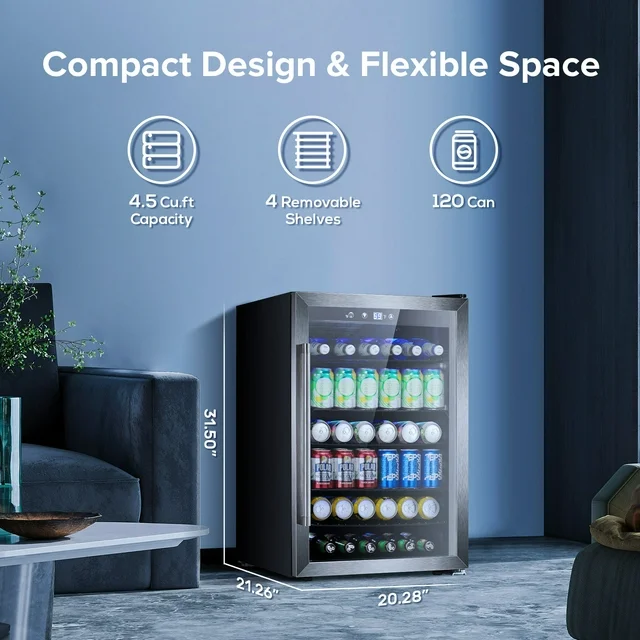COMPACT BEVERAGE COOLER: 20.5*21.3*31.4 inches mini refrigerator can keep a variety of canned drinks or wine chilled without taking up too much space at your home, dorm, bar, or office. It can conveniently hold 145 standard-sized drinks cans to impress your guests during parties, and this high-quality Beverage Refrigerator will surely fit and add an elegant accent to any home decor.