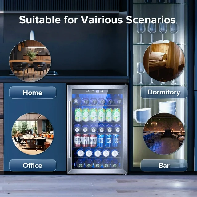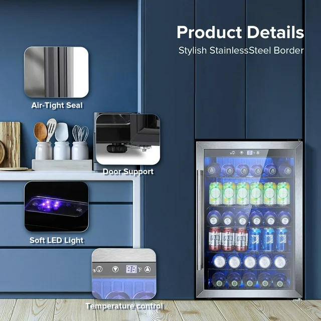 PERFECT CAPACITY:Auseo 4.4 Cu. Ft. The beverage Refrigerator features an elegant see-through, left hinge glass front door with a stainless steel frame for you to view your wine, beer, or soda at a glance. With its reinforced glass door with an airtight seal and help to maintain an ideal humidity level, this beverage refrigerator gives you a compact and modern design. Blue soft LED interior lighting not only beautifully showcases the wine or drink but also won't damage the wine or drink.
