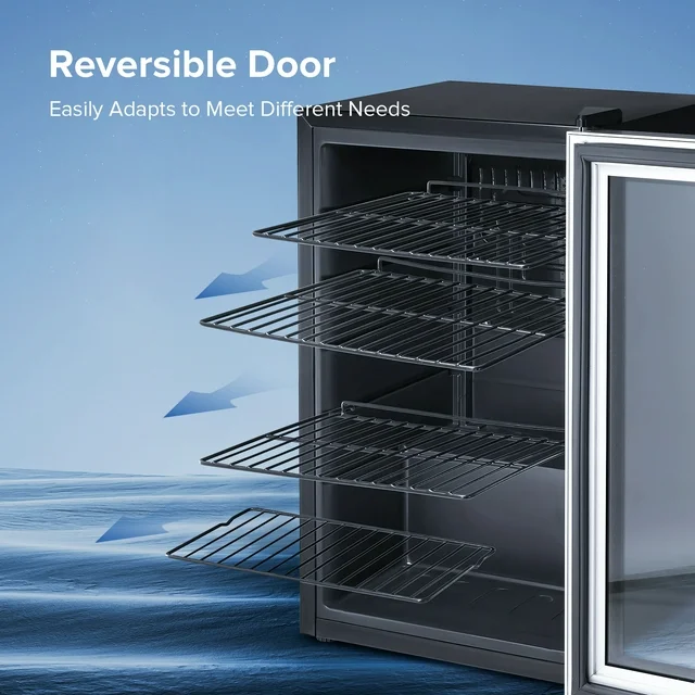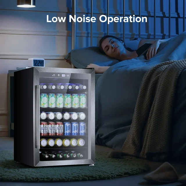NO VIBRATION and QUIET: Equipped with an advanced cooling system and a whisper-quiet compressor that works with a small convection fan to cool quickly, and keep consistent air circulation for a uniform temperature supply inside. Also equipped with Movable Black Shelves, Stainless Steel Glass Door, and Adjustable Leveling Legs. It is convenient for customers to move the position of the beverage cabinet, and they can drink cool drinks or wine anywhere.