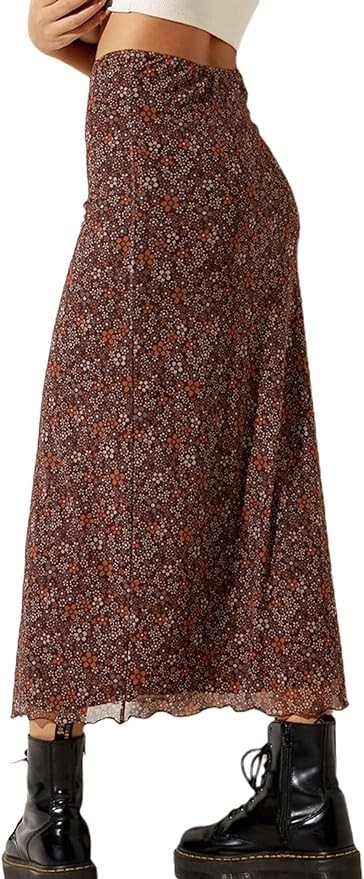 Avanova Women Floral Boho Mesh High Waist Midi Skirt Lettuce Trim Summer Skirt