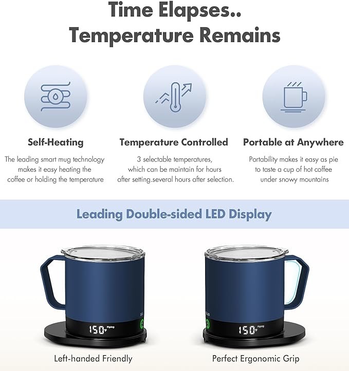 Auto Sleep Design with Larger 16Oz Capacity: The mug’s simple, elegant design matches any style at home and is also sleek and stylish enough to take to the office. The upgraded 16Oz capacity is perfect for slow sippers throughout the day. If the mug is turned on with no liquid in it, it will automatically turn off after 60 seconds of continuous flashing of error code E1 for 10 seconds.