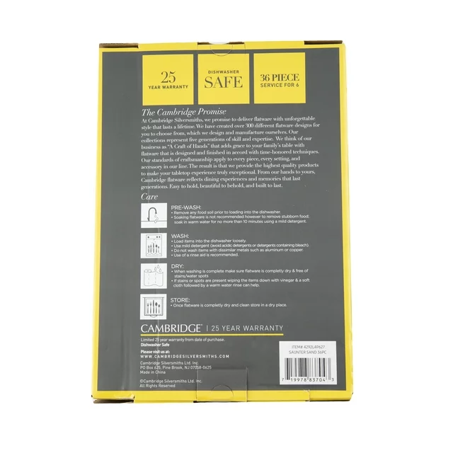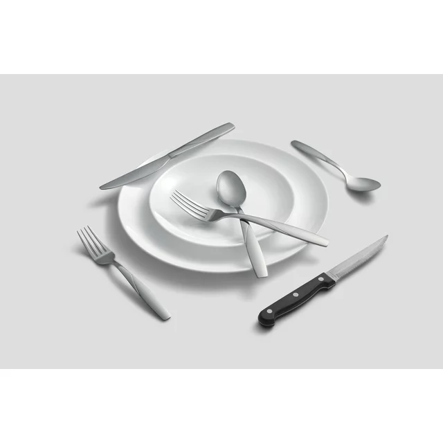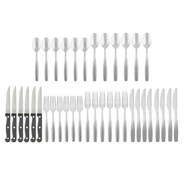 36 Piece Set includes 6 dinner forks, 6 dinner knives, 6 dinner spoons, 6 teaspoons, 6 salad forks and 6 steak knives