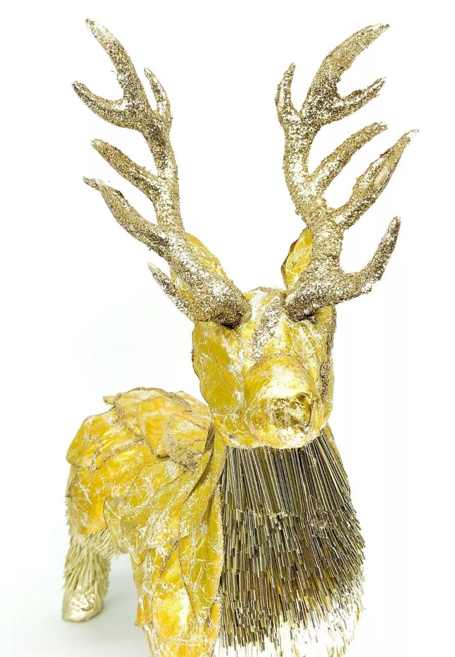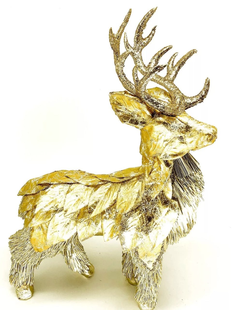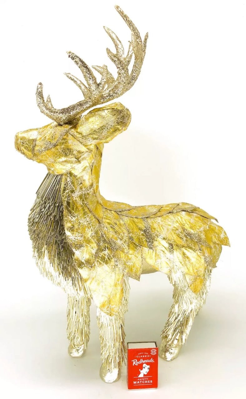Large stand alone Christmas reindeer mantle or table decor covered with gold fabric leaves and lots of glitter. This is super sparkly! I have two of these available if you are interested. No damage. Please see photos for size comparison.