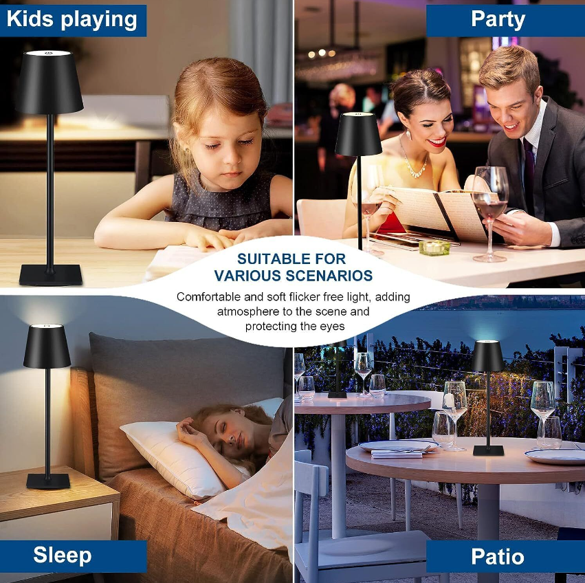 【3 COLORS & STEPLESS DIMMING】:Our cordless desk lamp has 3 color temperatures to choose from: white, warm and warm white. Control it by touching the switch, click to switch the light mode, long press to control the light brightness (10%-100%). And with memory function, when you turn on our table lamp again, it will automatically restore the last adjusted brightness.