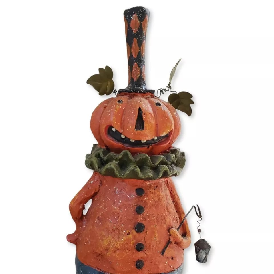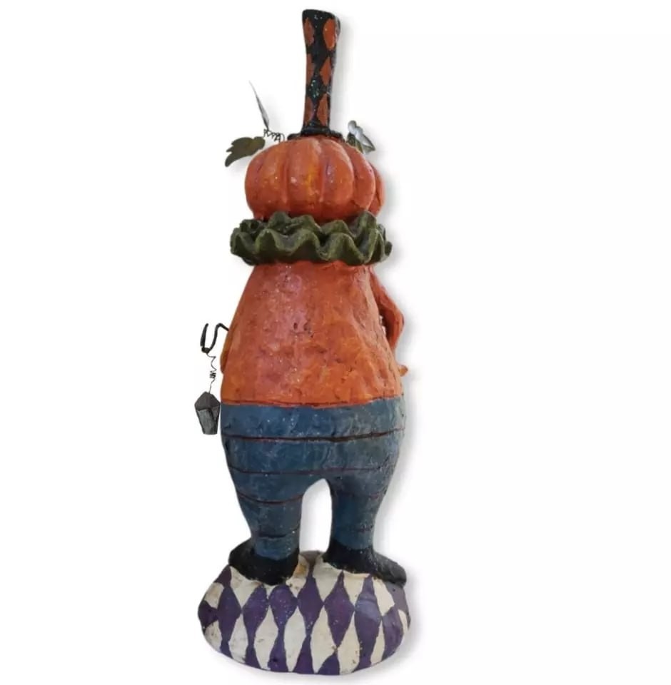 This is a CJF Folk Art grinning Jack O' Lantern Halloween figure. His glittery outfit is accented by his ruffled circus clown collar and his VERY tall top hat. A tiny little lantern hangs by his side. He measures approximately 22" tall, 8 1/2" wide and 6 1/4" deep. He's in very nice condition. There are a few scuffs but are not very noticeable because of his design.