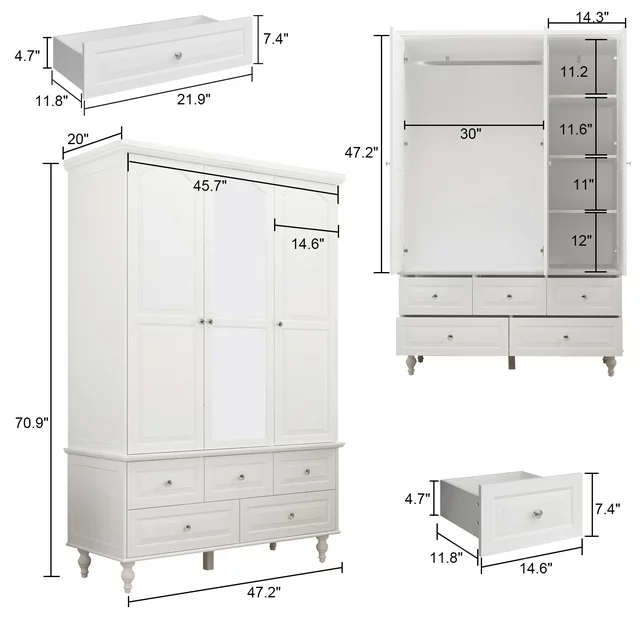 The 3 Door Armoire is the ideal solution to add storage space in the bedroom while also enhancing the decor. Made from premium quality materials, the armoire is quite durable and sturdy.The 3 Door Wardrobe features hanging rods inside the cabinet lets you hang more wrinkle-prone pieces. There are four shelves to store bag. The 3 Door Wardrobe is divided into two parts once part is a 2-door cabinet offers a hanging rod and the other cabinet with four shelves( fixed and flexible shelves) can be adjust to meet different hight. The five bottom drawers gliding on metal slides provide spacious storage for you can keep your blouses, T-shirts , pajamas ,jeans, sweaters neatly and stay where it belongs This Armoire is ideal for bedrooms with contemporary decors. The bottom compartment of the armoire offers The silver handles complete the piece with polish and add accessibility. It is easy to care for and can be wiped clean with a dusting cloth. Plus, one door boasts a mirrored front, allowing you to check your look before taking on the day. Crafted from premium MDF in white Finish, this cabinet is perfect for any contemporary, modern, cottage, shabby chic or casual spaces.