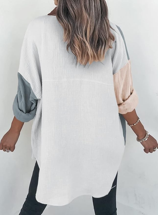 Feature: Color block, Solid Color, Front Button Closures, Bust Pocket, Long Sleeves with Button Cuffs, wear as 3/4 sleeves or full sleeve, Turn-Down Collar, Boyfriend Style, Loose Fit Shirts
