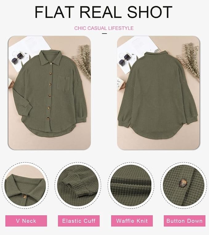 Comfy Shirts: The Waffle Knit Button Down Shirt Softly Falling Material Can Convince With a Lot Of Comfort.The Skin-Friendly,Lightweight Quality Is Comfortable to wear,Flowing Look.Thanks To Its Loose Cut And Boyfriend Style,The womens shacket jacket Fit For Most Figures