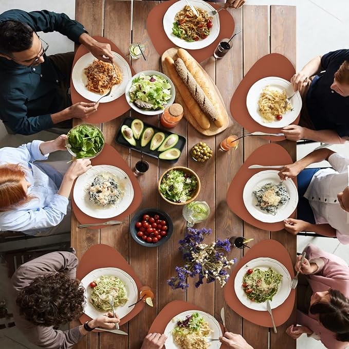 ?【EASY TO CLEAN AND CARE】The leather place mats is washable and easy to clean up, clean the place mat in time after dirty, wipe with a wet cloth or rinse with running water, wipe or air dry. No machine wash. Non-fading, it can roll up to store away, leather placemat can be flattened when put out to use.