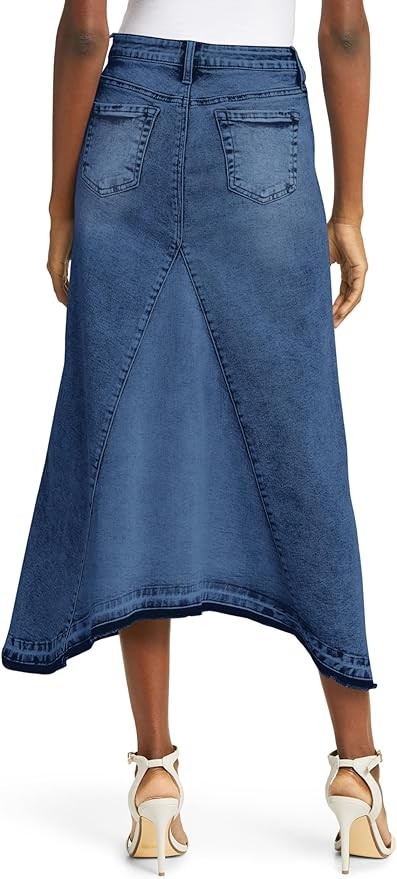 • The high waist denim maxi skirt features a unique and eye-catching pieced asymmetric design. With different panels of denim sewn together in an asymmetrical pattern, this comfy skirt adds a touch of modernity and edginess to your outfit. The pieced asymmetric design sets it apart from traditional denim skirts, making it a stylish and trendy choice for those who want to make a fashion statement.
