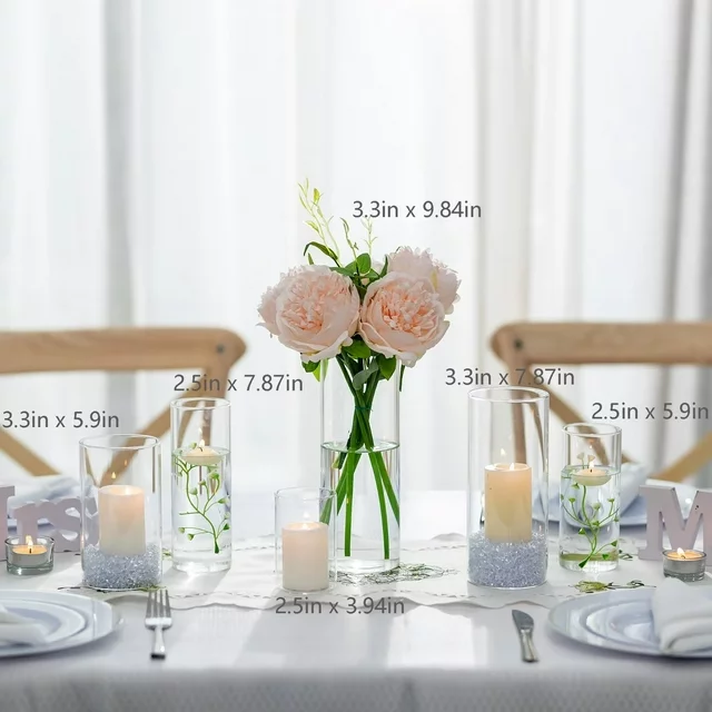 Two different sizes for your choice: (1) 3.3" Diameter, in 3 different heights-9.8",7.9" and 5.9", fits long stem flowers, 3" floating candles or pillar candles. (2) 2.5" Diameter, in 3 different heights-4", 5.9" and 7.9", works beautifully as flower vases or candle holder ( fits 2" diameter floating or pillar candles).