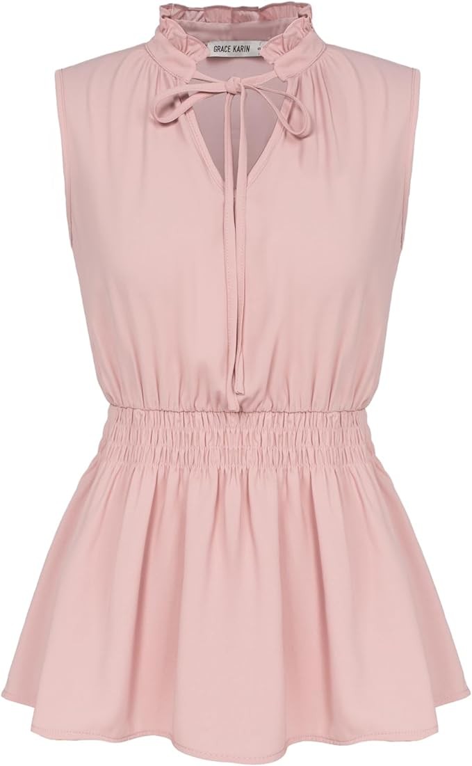 【Features】Sleeveless / Stylish Ruffled Stand Collar / V-Neck with String / Elastic Waist Band / Cute Ruffle Hem / Relaxed Fit / Dressy Elegant Casual Blouse / Hip Length / Summer Tops for Women 2024 / Comfortable and Lightweight / Fashion Blouse Top for Women