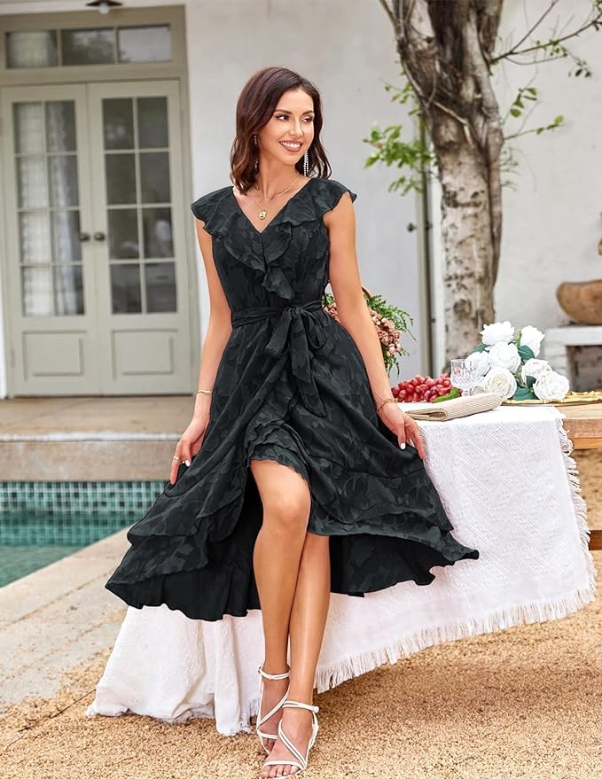 CHIC RUFFLE DRESS FOR YOU! Wedding Guest Dresses For Women / Long Dress For Women / Ruffle Wrap Dresses / Women Casual Dresses / Sleeveless Dress For Women / Elastic Empire Waist With Belt / Flared A-Line Dresses / Women Beach Dresses / Flowy V Neck Dress For Women.