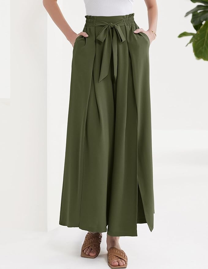 Features: This womens slit palazzo pant sit high at the waist and features a wide elastic waistband with tied belt. The bow tie make it flexible and stylish. The pleats and splits at the front of the pants make the paperbag pants are loose and flowy for women of all body types, even if you have thick thighs. Our high waisted beach pants have 2 pockets, which is convenient to hold phones and key. Solid color and boho ethnic print pants, we will provide customers with more colors.