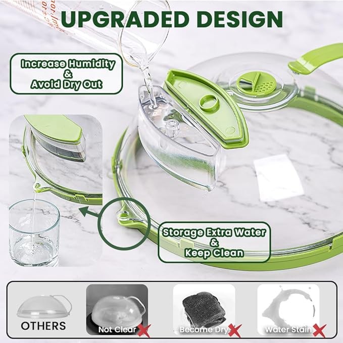 PREVENT FOOD FROM DRYING: Our upgraded microwave food cover with a water storage box, adds water before use, can increase humidity, and help maintain the moisture and taste of food. This tall microwave plate cover with a dome design avoids contact with foods, perfect instead of cling wrap. What's more, our cover with a diversion groove to store additional steam water, no worrying about water stains. Please rotate the green 360° adjustable vent to the exhaust state when heating.
