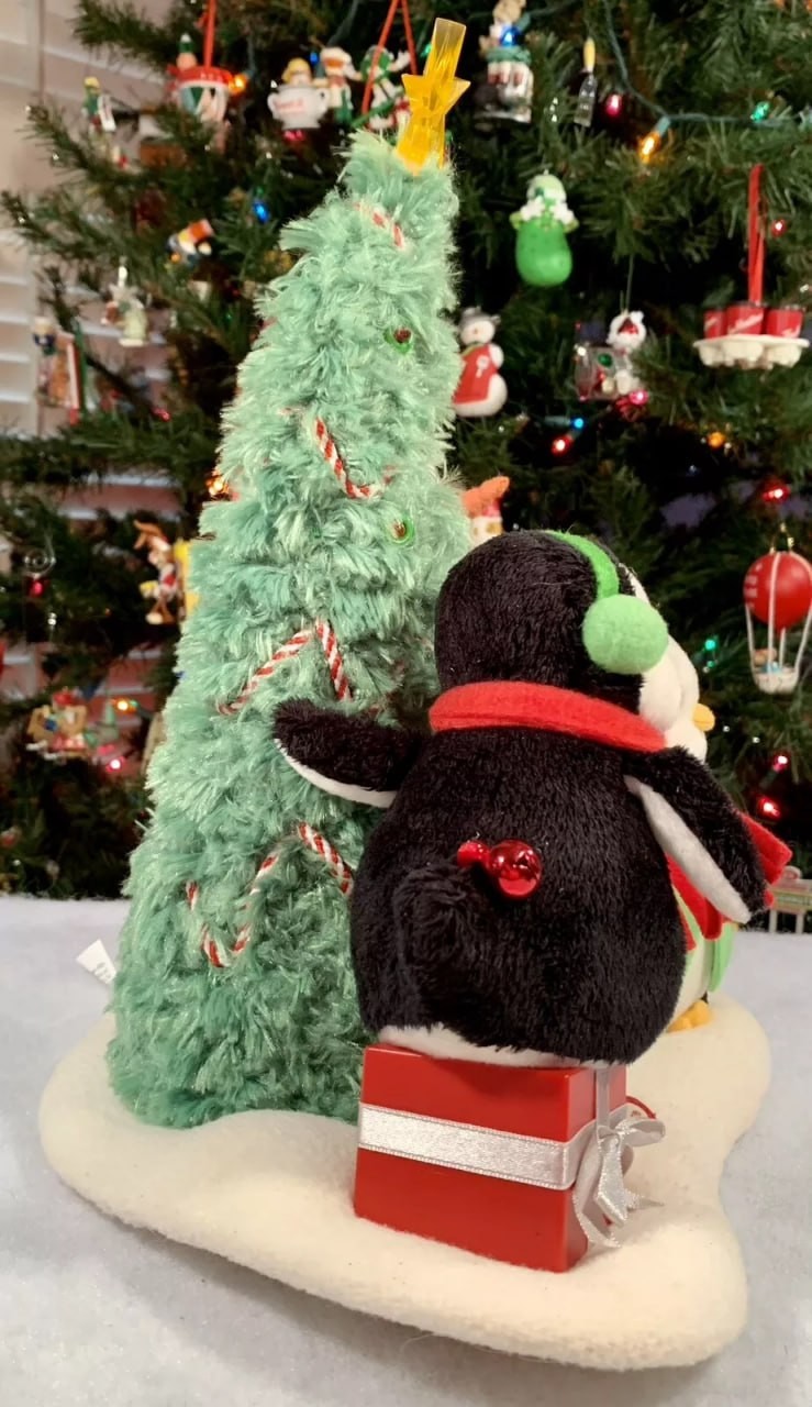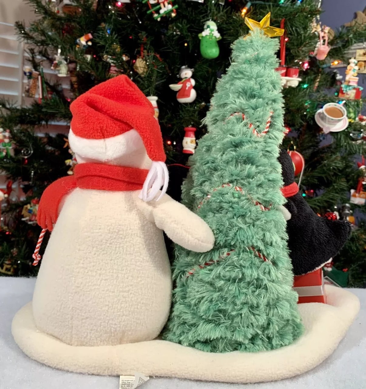 Plays ROCKIN AROUND THE CHRISTMAS TREE while the tree lights blink and characters dance.