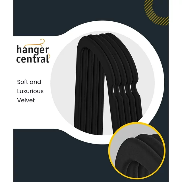 Set of 50 Hanger Central velvet clothing hangers measures 17. 5 by 0.24 by 9.06 inches each; 360-degree rotate feature. Strong enough to hold 10 pounds; ultra-thin construction is sturdy enough to hold your coats and pants. Made of sturdy material; the set of 50 hangers can hold and organize your clothes, saving space and tidying up your closet. Soft velvet, instead of plastic or metal, leaves no crease on a pair of pants when folded over, or a shirt or top hung over top. Non-slip black velvet design, with chrome finishing, ensures secure hanging of your clothes with a slim and sleek construction to maximize space in your closet.