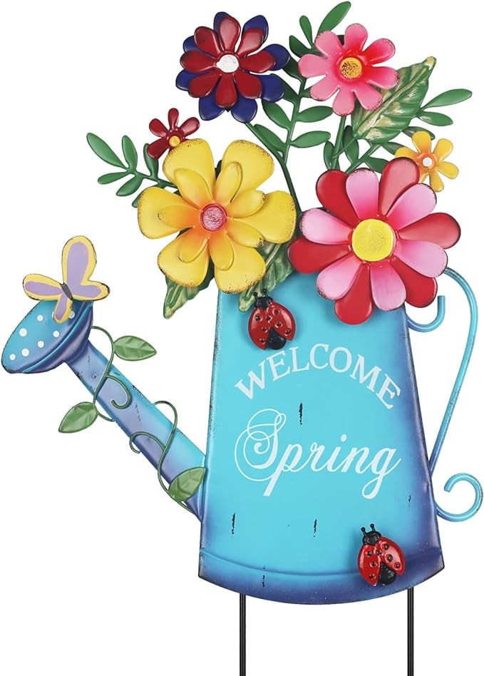 ?【BRIGHT UP YOUR GARDEN】Bring the enchanting beauty of spring indoors with our exquisite garden stake. Crafted in the shape of a watering can, this stunning piece features an array of colorful iron flowers blooming on its surface, accompanied by charming ladybugs and butterflies. Adorned with the uplifting words "WELCOME" and "Spring," this piece not only adds a touch of elegance but also welcomes the fresh energy and vibrant colors of the season into your space.