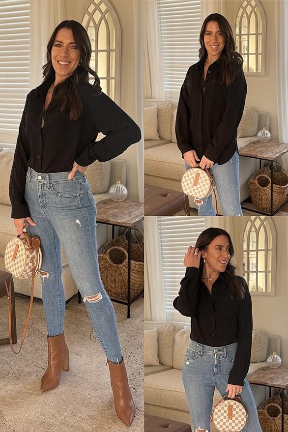 ❤Unique Design Button Down Blouse: The classic women's button down shirt, long sleeve(can also be worn as 3/4 sleeves), special wavy texture, drop shoulder, full button front, V neck collared, with covienien pocket, boyfriend loose fit to casual style for an effortlessly chic outfit! It has easily become one of your closet staples.