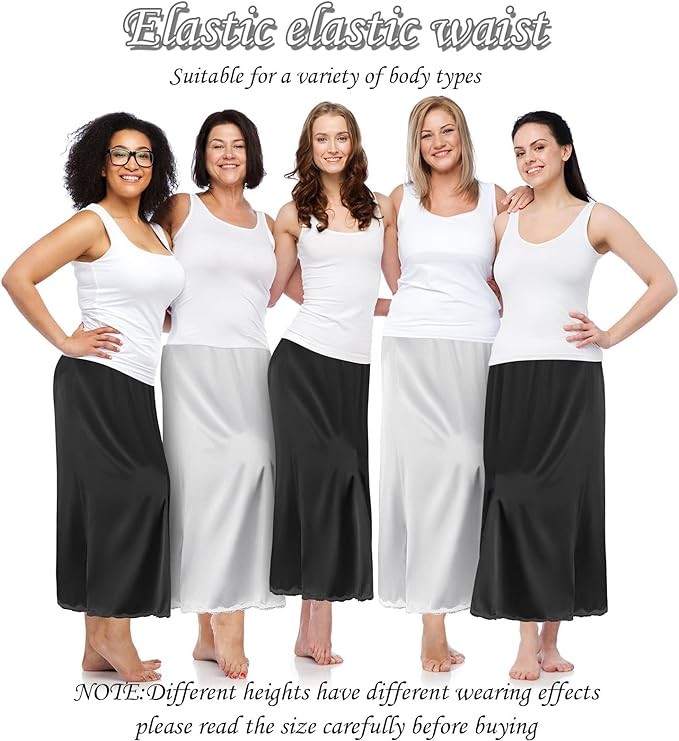 • Different Sizes for You to Choose: the waist of our long skirt slip measures approx. 35.5-55.4 inches, 36.2 inches in length each, which is a proper size for women who need a long skirt; Please note that our skirt length varies according to your height, so please be sure to read the size before purchasing; The length may be below the calf for tall women and at the ankle for short women