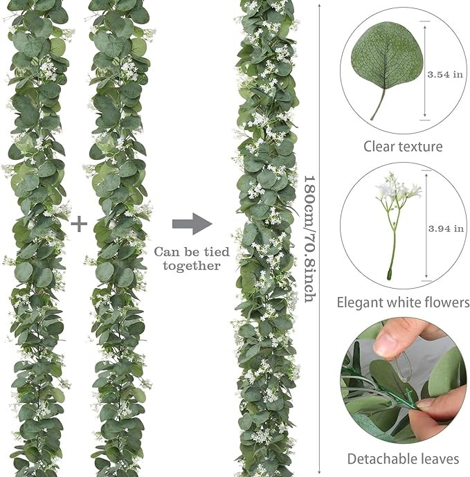 ?【Quantity and Size】Package includes 4 pack faux eucalyptus garlands. Each greenery garland is about 5.9 FT Long, with lush silver dollar eucalyptus leaves and many beautiful white flowers. Our artificial garlands look very full, three-dimensional and layered, and more dense than other hanging vines.