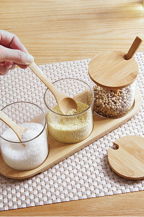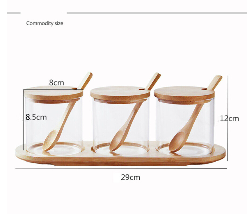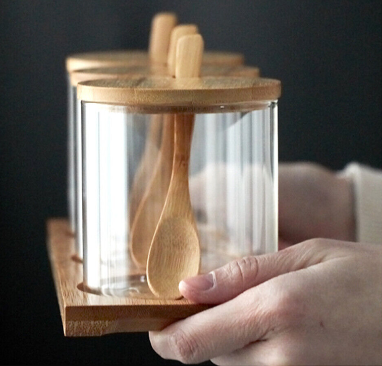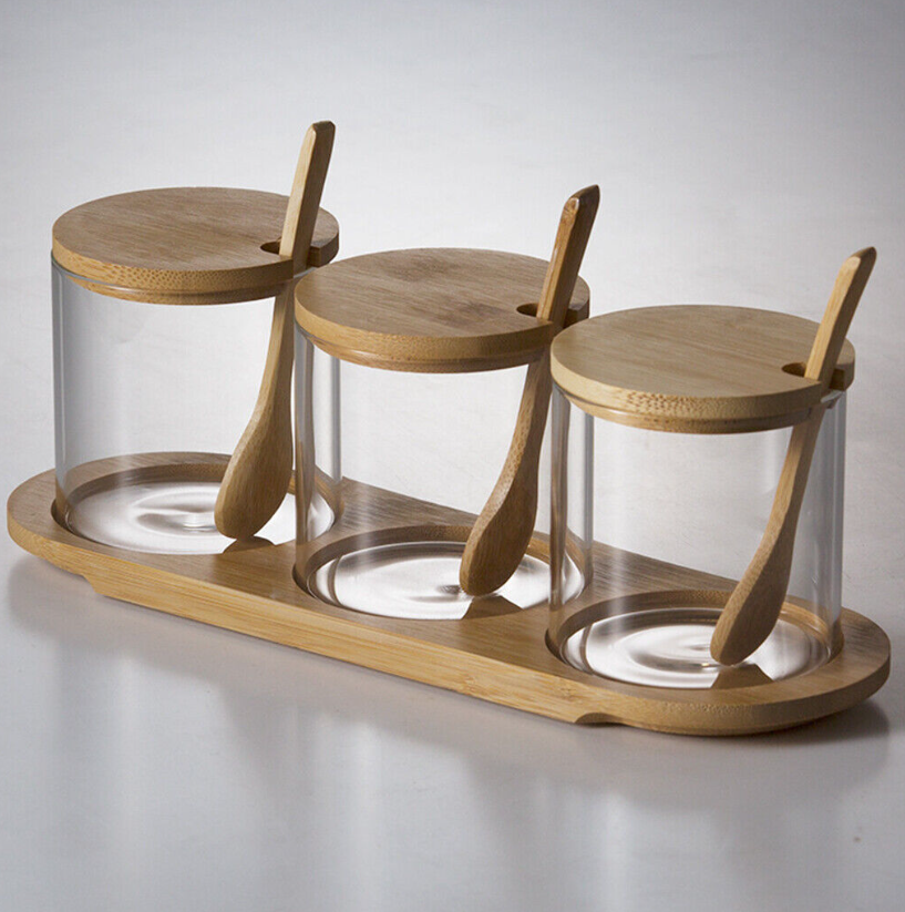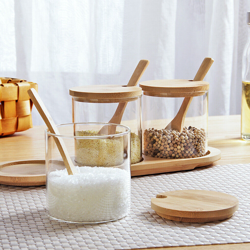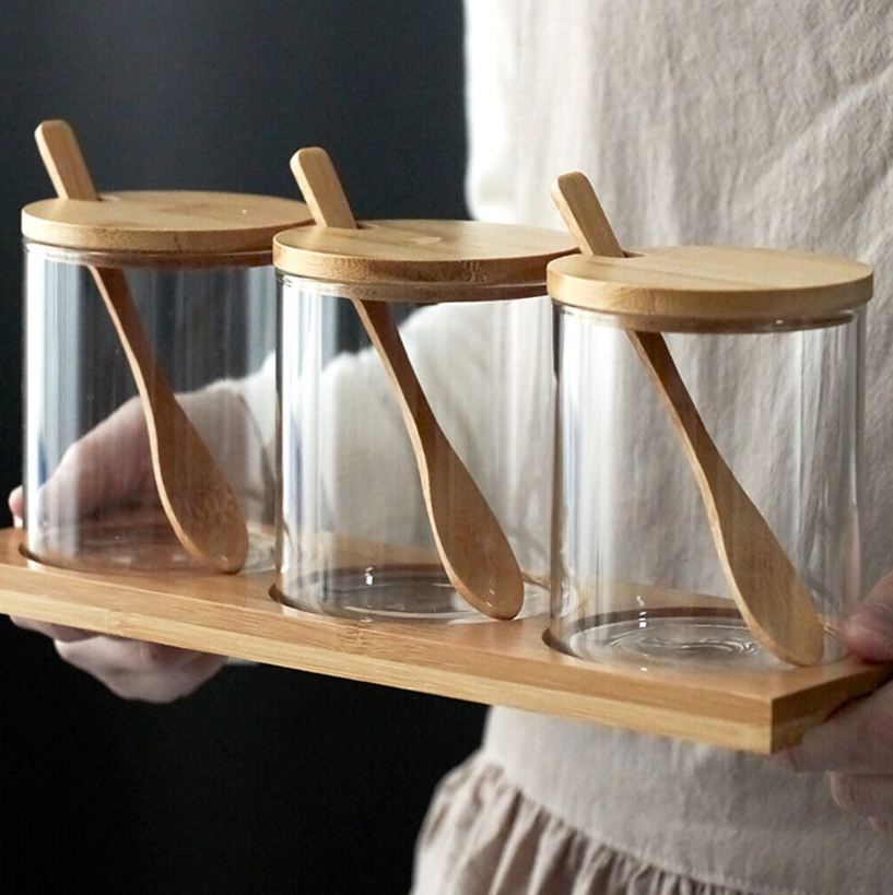 Kitchen Glass Storage Jar with Bamboo Lid Seasoning Canister Can Organizer