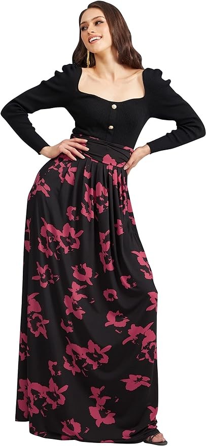 • High waist Black & Pink skirts for casual wear; pleated jersey maxi skirt; vintage floor length skirts; bohemian flower maxi skirt for day time; ladies long spring summer skirts; church choir funeral outfit; travel holiday vacation casual skirt