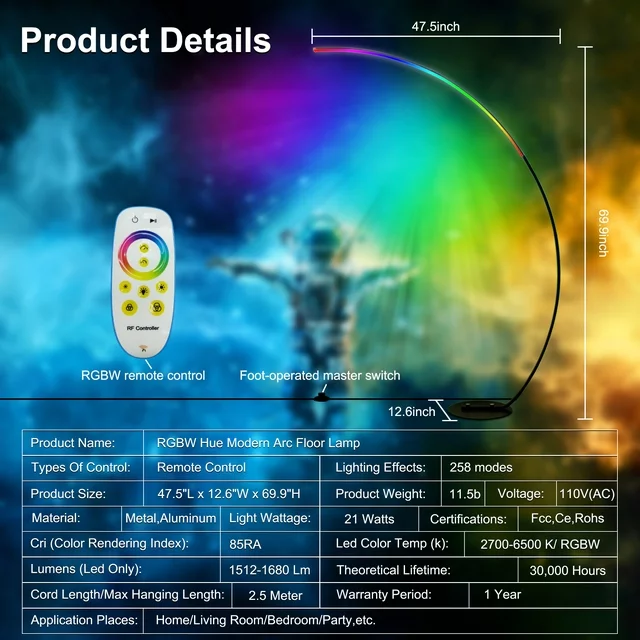 The tall, minimalist RGBW Modern Curve Lamp is the ultimate mood lighting for your living room, office, or bedroom. The sleek design melds perfectly with a contemporary flair to match any home decor style. It features a built-in RGBW LED Strip with 3 white lighting effects, 16 million color options and 358 kinds of light effects. This power-saving LED bulb is good for 20 years with normal use. You'll never have to replace a bulb and save 90% more energy compared to standard halogen or incandescent bulbs.