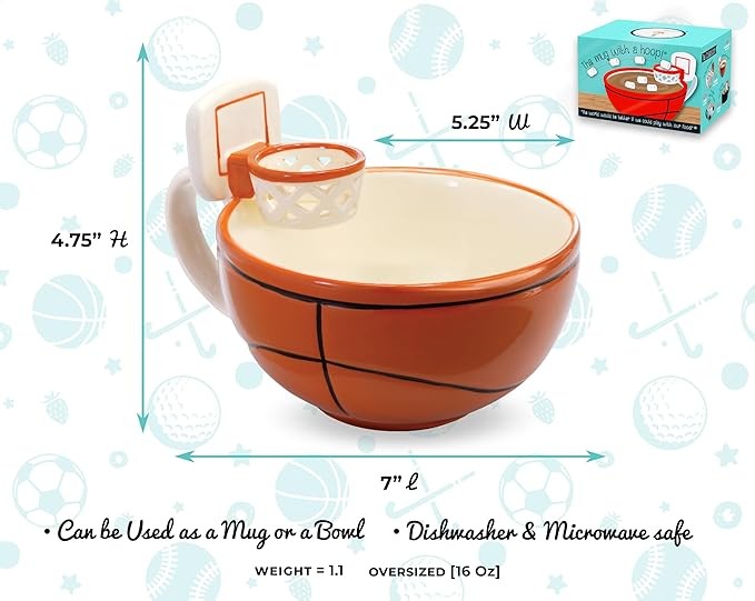 Big Basketball Mug – Interactive basketball coffee mug with mini hoop. Oversized cup or basketball bowl. Fun for tossing mini-marshmallows into hot cocoa, cereal into milk etc.