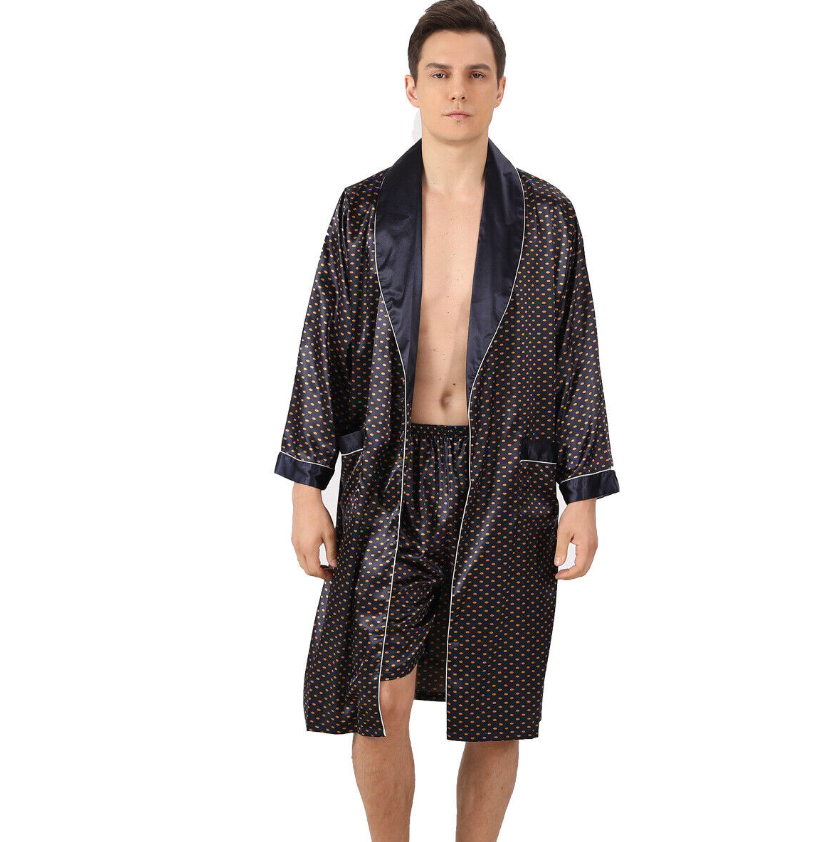 Men's Printed Satin Robe Set Silk Kimono Bathrobe with Shorts Comfy Nightgown Pj