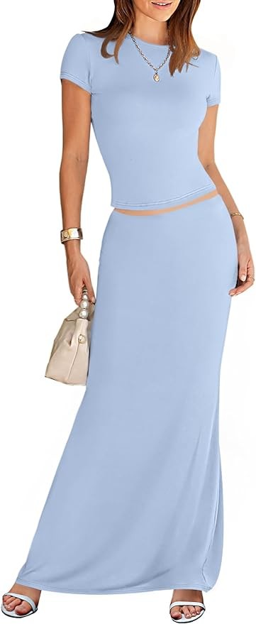 Features: Short sleeve, round neck, slim fitting short top paired with mermaid long skirt, enhancing curves, solid color, sexy Y2K style, bodycon dresses for women, skirt sets women 2 piece outfits.