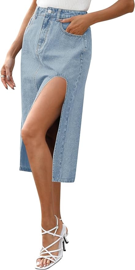 • Features: Solid color, denim fabric, high waist, midi length, below knee length, a line, side slit thigh skirt, front and back pockets, button and zipper closure, sexy, trendy and casual, loose fit, skirts for women 2024, jean skirts for women denim.