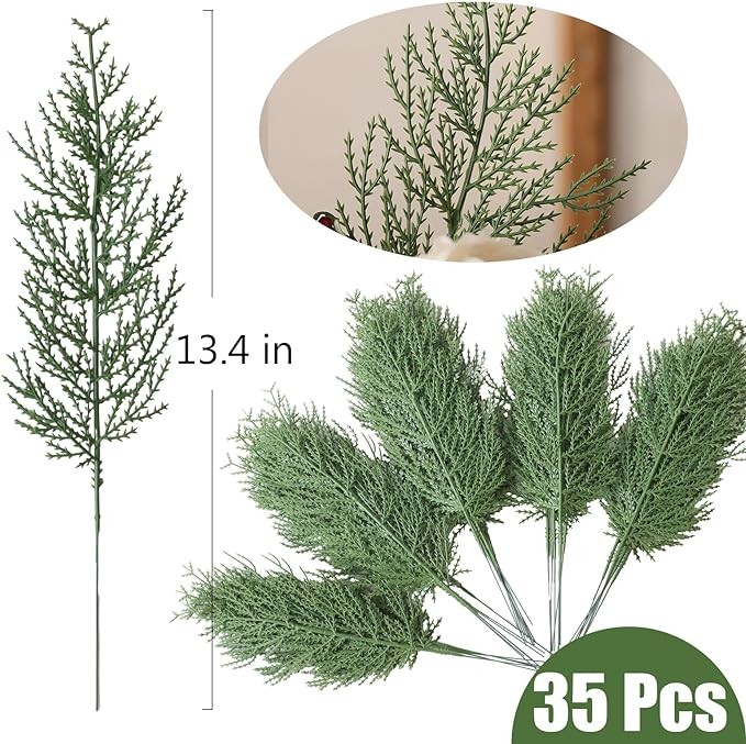 ARTIFICIAL PINE BRANCHES - The packaging includes 35pcs of artificial pine branches, each with a length of 13.4 inches. They are realistic and beautiful, You can easy DIY and decorate your space, enjoy a happy holiday atmosphere.