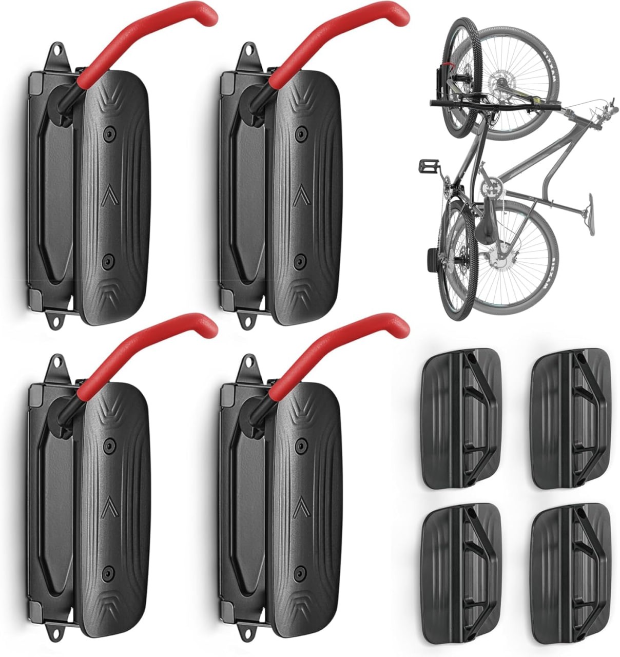 【Strong, Safe & Secure】 monTEK bike wall mount is made of heavy-duty solid steel are able to hang weights up to 30 kg / 66.2 lbs. Rubber coated wall bike rack relieves pressure on the wheels, rims, and spokes and protects from unwanted scratches. The wall-mounted tire stop not only safeguards your bike but also protects your wall from unsightly scratches. Swivel bike wall mount - Hang and store your bike in a vertical position, allowing for convenient storage and removal.