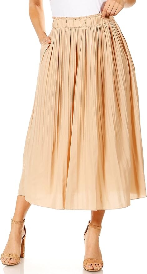 STYLE - Featuring a high waisted fit, chic pleated style and 2 side pockets, the midi skirt is the ideal piece your closet needs. The elastic waistband gives great stretch, and the in seam side pockets are great for carrying small items. The aline style falls to an elegant hem that hits at midcalf length.