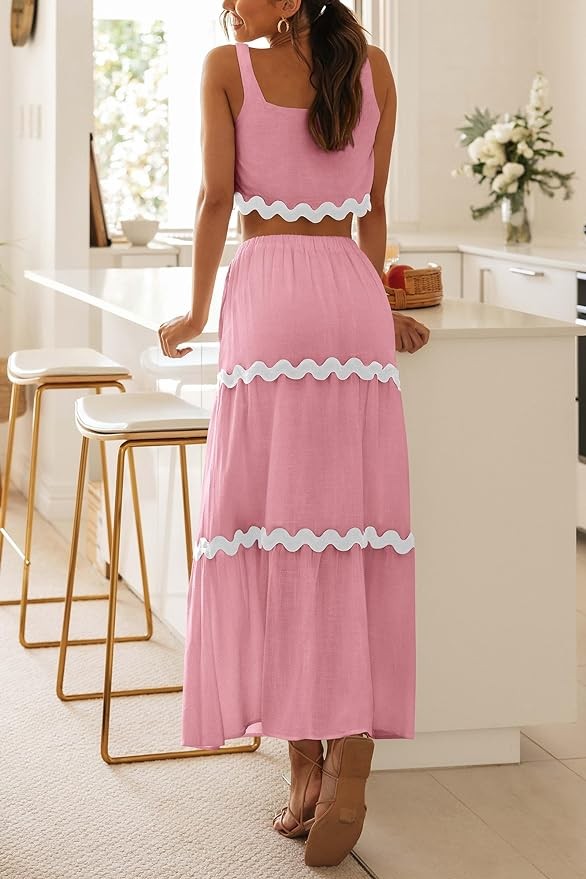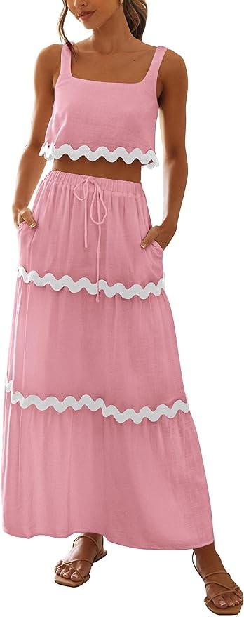 • WOMENS CROPPED TOP AND SKIRT SET: This Stylish Piece is a Sleeveless Top with a Square Neckline, Perfect for Keeping Cool in Hot Days. Cropped Length Highlights your Waistline, Making it an Essential Piece in your Closet. Womens Maxi Skirt Offers a Relaxed and Roomy Fit, Providing Ample Comfort and Freedom of Movement. The Frills Create an Elegant and Playful Look, Perfect for Any Occasion