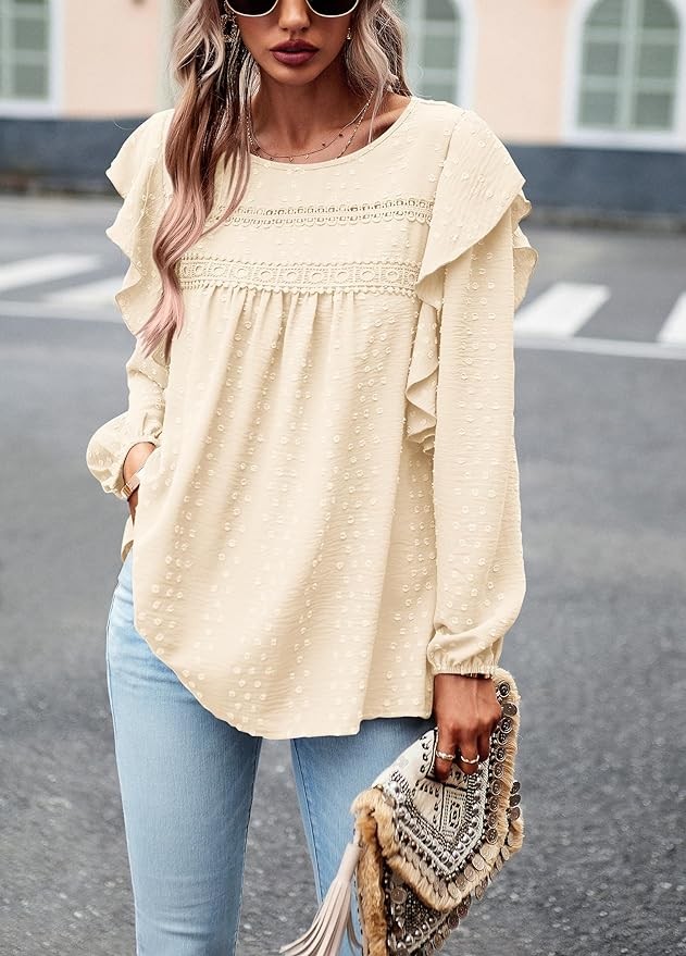 • Design: Swiss dot fabric make this blouses for women fashion suitable for both dressy and casual occasions. Crochet and pleats at bust make this long sleeve tops feminine and chic, ruffle shoulder add cuteness for this blouses for women. Loose fit and tunic length are designed to be suitable for all body type, which can covers your hips
