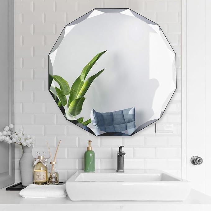 HIGH-QUALITY MATERIALS: This shaped mirror is made of a 5mm lead-free and copper-free mirror and a 9mm black density board, which could present a clear reflection. The size of this asymmetrical mirror is about24"*24"