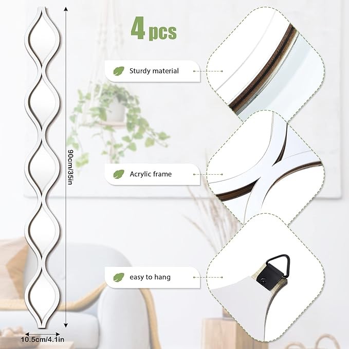 Plentiful Quantity for Usage: you will receive 4 pieces silver teardrop mirror wall decors, each with 1 triangle hook on the back, and each decorative mirror measures approx. 90 x 10.2 cm/ 35.4 x 4 inches and approx. 9 mm/ 0.35 inch in thickness